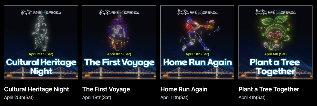 廣安里無人機主題每個星期都不同,主題會在官網看到,大多數會根據節目、季節等更換主題。查詢2026年最新主題︰按我查詢<공연안내 >。普通主題約有1000台無人機,但若是特別演出活動則為1500台~2000台無人機,表演會更精彩。