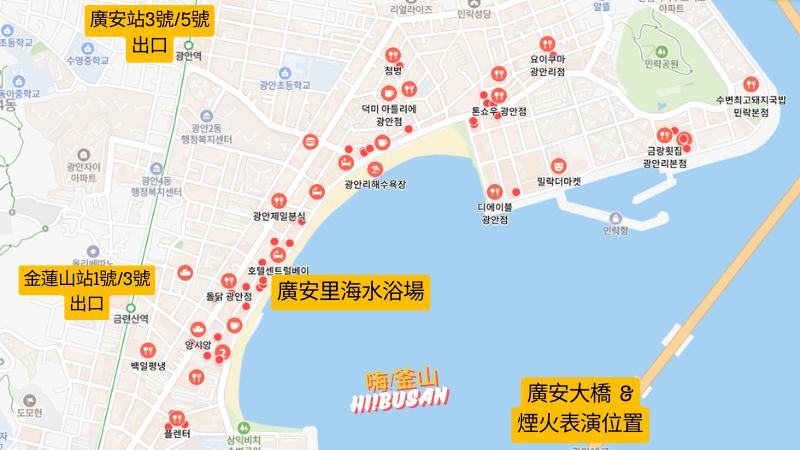 - 釜山煙火節地點:廣安里海水浴場 광안리해수욕장(Google Maps / Naver Map)